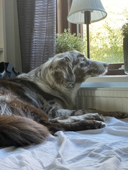 Han är en matglad kille och tar belöning i mat/godis men också leksaker och har börjat vänja sig vid att beröring också är en typ av belöning.
