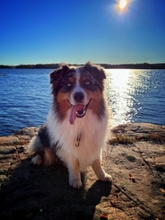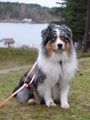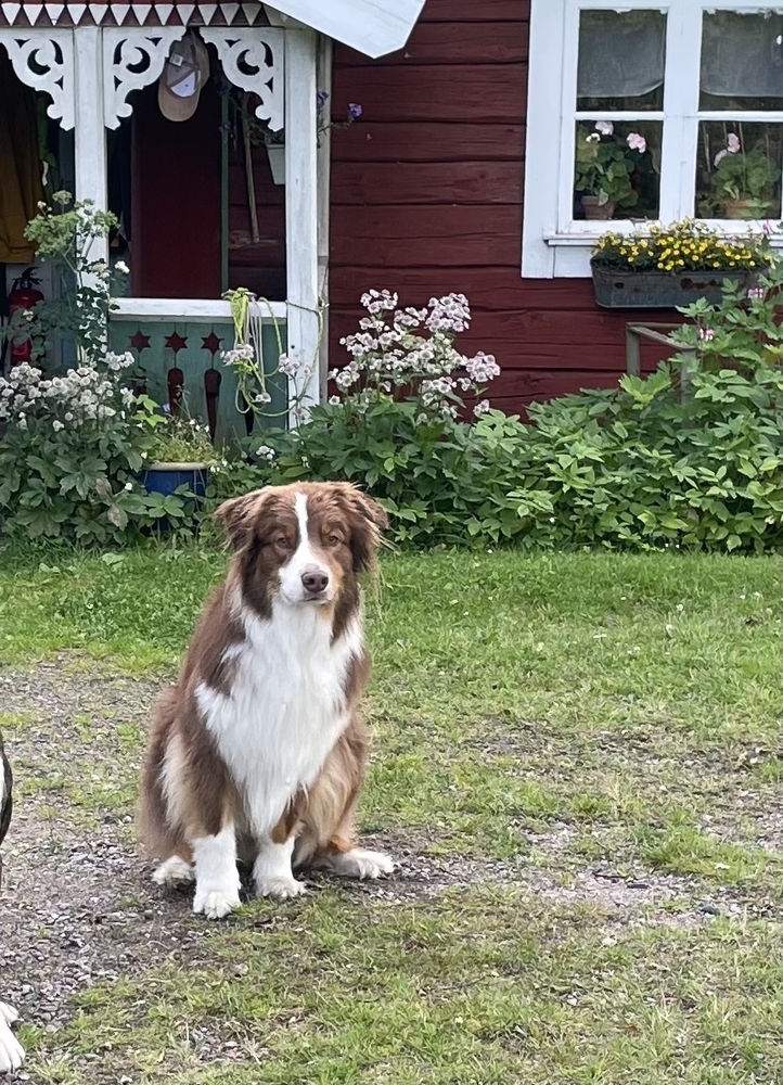 Pixel (dewhopps Logan) är en 5-årig okastrerad Australian Shepherd hane med mycket charm och karaktär. Det bästa han vet är att bada och apportera pinnar, helst samtidigt. Det kan han göra hur länge som helst om han fick välja. Pixel älskar sin flock och är mycket lojal och lyhörd. Han kan känna in hur alla mår och håller sig nära i alla lägen, även om det ibland blir lite för varmt i sängen och soffan, då sover han helst på det svala golvet. Pixel är en riktig clown som bjuder på många skratt och tokigheter i vardagen. Han är aktiv och arbetsvillig. Tillsammans har vi tränat allt möjligt, bland annat spår, personsök, specialsök, patrull och lydnadsmoment. Vi har även testat på vallning, något han troligtvis skulle älska att få göra mer av, dock är han för het just nu och vill gärna jaga, så mer träning behövs och det finns ingen garanti för att han skulle klara av det. Pixel går att belöna md godis, men lek är ännu bättre. Dragkamp och jaga frisbees är nog den bästa belöningen, och det är något han fått ofta efter avklarat moment.