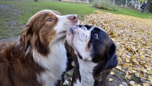 Han fungerar bra med andra hundar när han är lös men kan ibland hetsa upp sig över vissa hundar när han går i koppel.