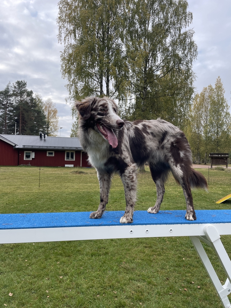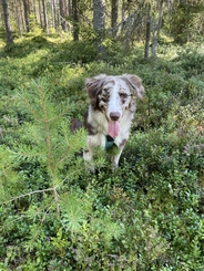 Pixel (dewhopps Logan) är en 5-årig okastrerad Australian Shepherd hane med mycket charm och karaktär. Det bästa han vet är att bada och apportera pinnar, helst samtidigt. Det kan han göra hur länge som helst om han fick välja. Pixel älskar sin flock och är mycket lojal och lyhörd. Han kan känna in hur alla mår och håller sig nära i alla lägen, även om det ibland blir lite för varmt i sängen och soffan, då sover han helst på det svala golvet. Pixel är en riktig clown som bjuder på många skratt och tokigheter i vardagen. Han är aktiv och arbetsvillig. Tillsammans har vi tränat allt möjligt, bland annat spår, personsök, specialsök, patrull och lydnadsmoment. Vi har även testat på vallning, något han troligtvis skulle älska att få göra mer av, dock är han för het just nu och vill gärna jaga, så mer träning behövs och det finns ingen garanti för att han skulle klara av det. Pixel går att belöna md godis, men lek är ännu bättre. Dragkamp och jaga frisbees är nog den bästa belöningen, och det är något han fått ofta efter avklarat moment.